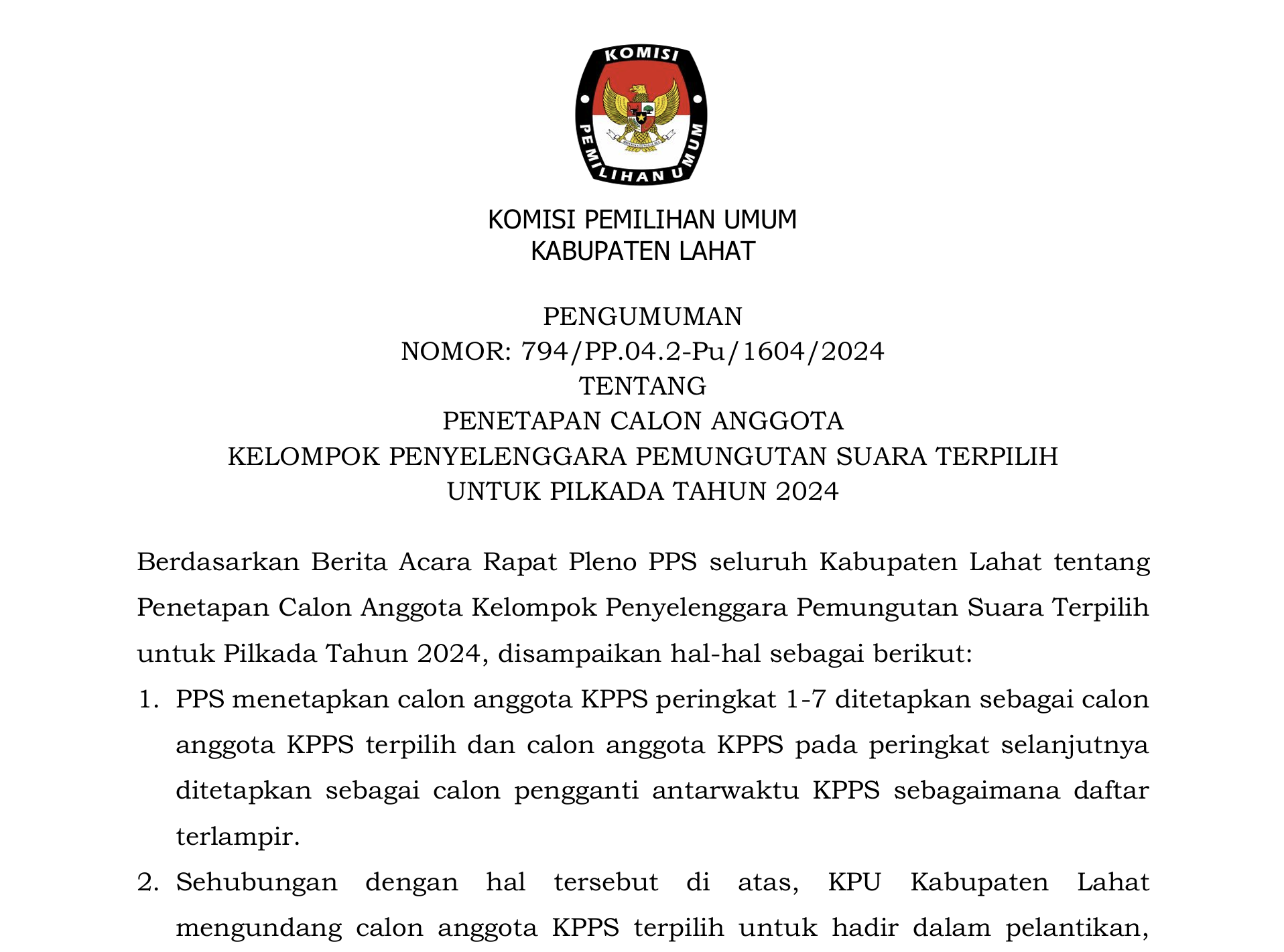 PENGUMUMAN KPPS TERPILIH PILKADA TAHUN 2024 Kamis, 07 November 2024 08:11 749 Pengumuman selengkapnya dapat diunduh disini Baca Selengkapnya