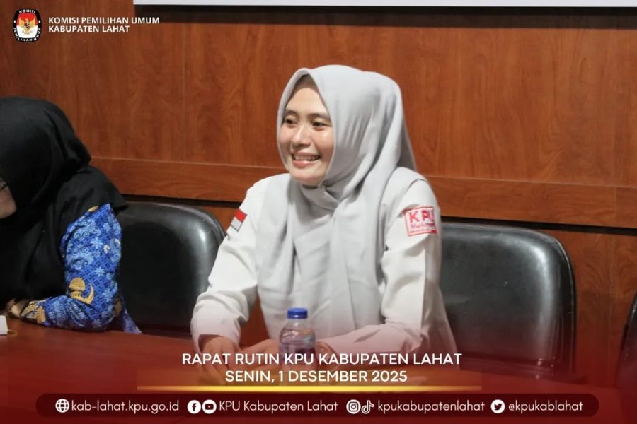 #TemanPemilih Senin, (1/12/2025) KPU Kabupaten Lahat melaksanakan rapat rutin bersama Anggota KPU Kabupaten Lahat Divisi Sosialisasi, Pendidikan Pemilih, Partisipasi Masyarakat dan SDM Eva Metriani, Sekretaris KPU Kabupaten Lahat Mery Anggrainy, para Kasubbag, dan staf sekretariat KPU Kabupaten Lahat.