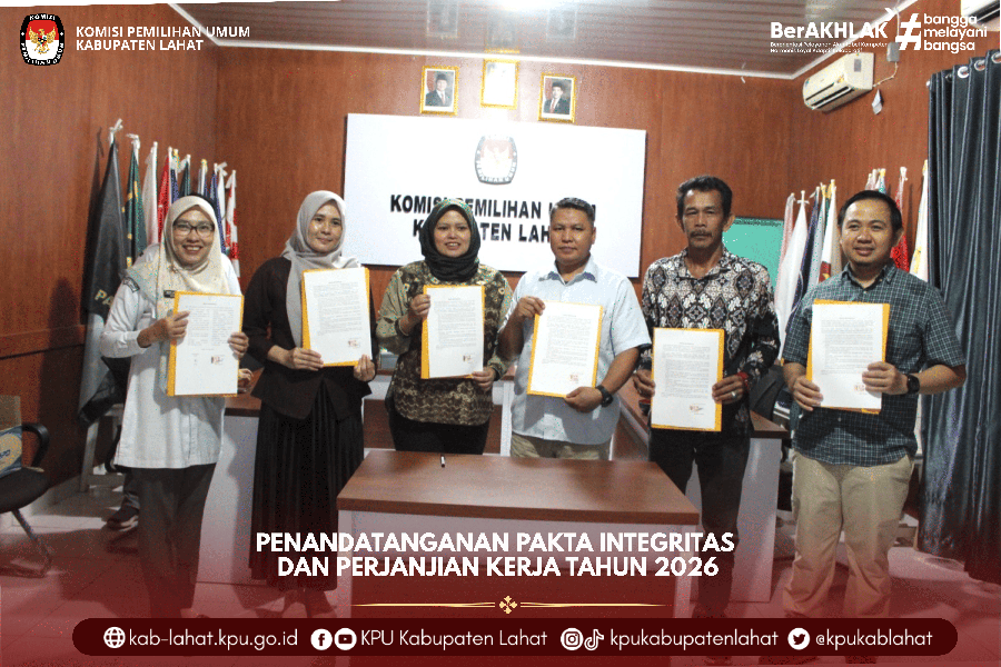 #TemanPemilih, kamis (15/01/2026) KPU Kabupaten Lahat mengikuti Kegiatan Penandatangaan Pakta Integritas dan Perjanjian Kinerja Tahun 2026, kegiatan diikuti oleh Ketua, Anggota, Sekretaris dan seluruh pejabat struktural serta pejabat fungsional KPU Kabupaten Lahat.