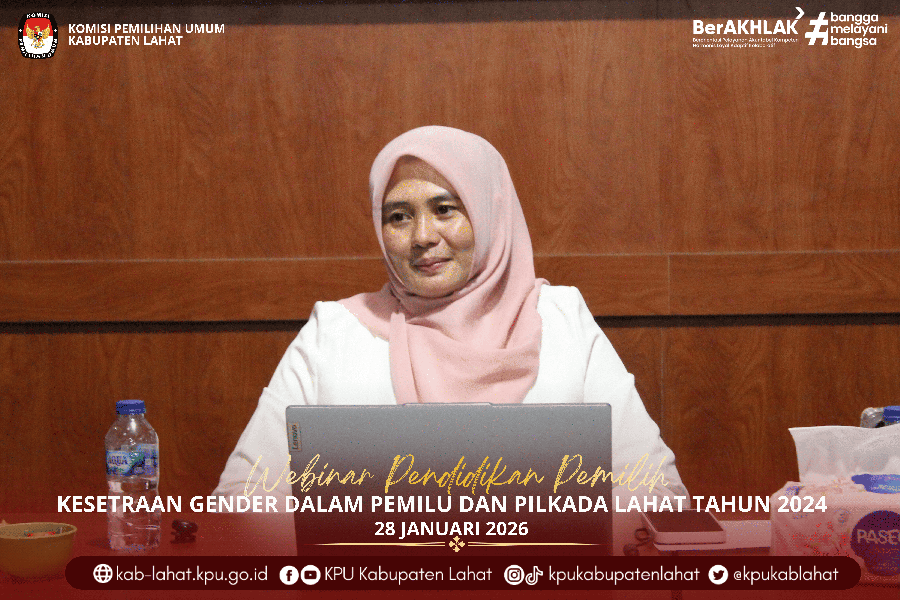 #TemanPemilih, Rabu, (28/1/2026) Anggota KPU Kabupaten Lahat Eva Metriani hadir sebagai narasumber dalam kegiatan Webinar Pendidikan Pemilih dengan tema " Kesetaraan Gender dalam Pemilu dan Pilkada Lahat Tahun 2024" yang dilaksankan oleh KPU Provinsi Sumatera Selatan.