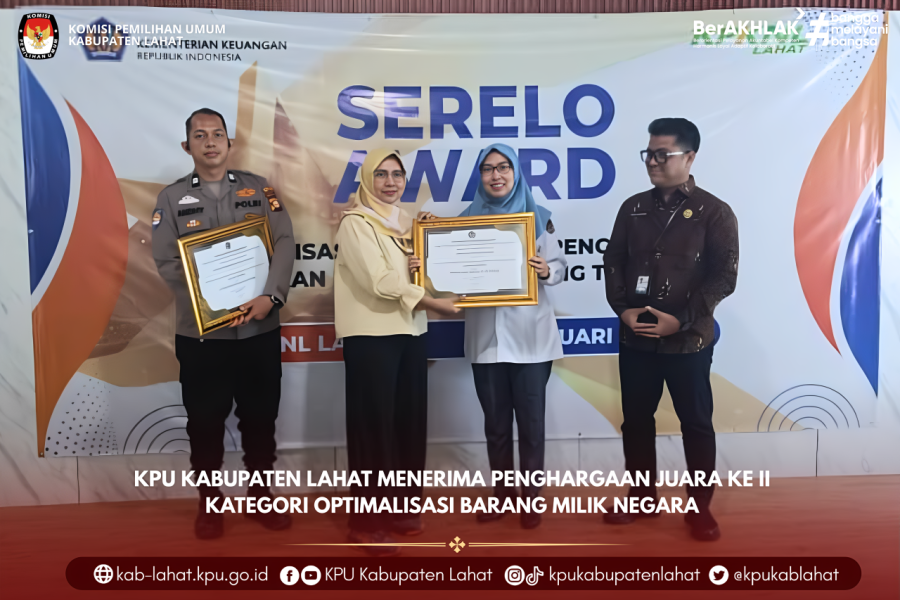 #TemanPemilih KPU Kabupaten Lahat menerima penghargaan Juara Ke II dalam Kategori Optimalisasi Barang Milik Negara yang diberikan oleh Kantor Pelayanan Kekayaan Negara dan Lelang (KPKNL) Lahat.