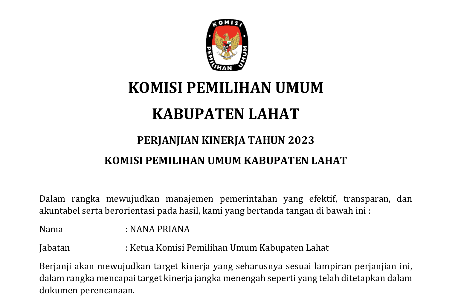 PERJANJIAN KINERJA KPU KABUPATEN LAHAT TAHUN 2023 Jumat, 12 Juli 2024 07:00 697 Pengumuman selengkapnya dapat diunduh disini Bagikan: Telah dilihat 697 kali