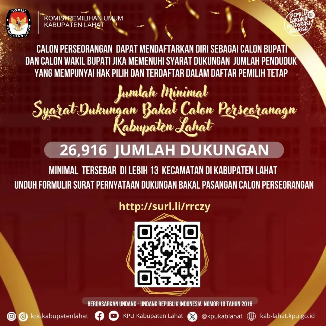 JUMLAH MINIMAL SYARAT DUKUNGAN BAKAL CALON PERSEORANGAN KABUPATEN LAHAT Senin, 18 Maret 2024 07:00 684 Calon Perseorangan dapat mendaftarkan diri sebagai Calon Bupati dan Calon Wakil Bupati jika memenuhi syarat dukungan jumlah penduduk yang mempunyai hak pilih dan terdaftar dalam pemilih tetap Baca Selengkapnya