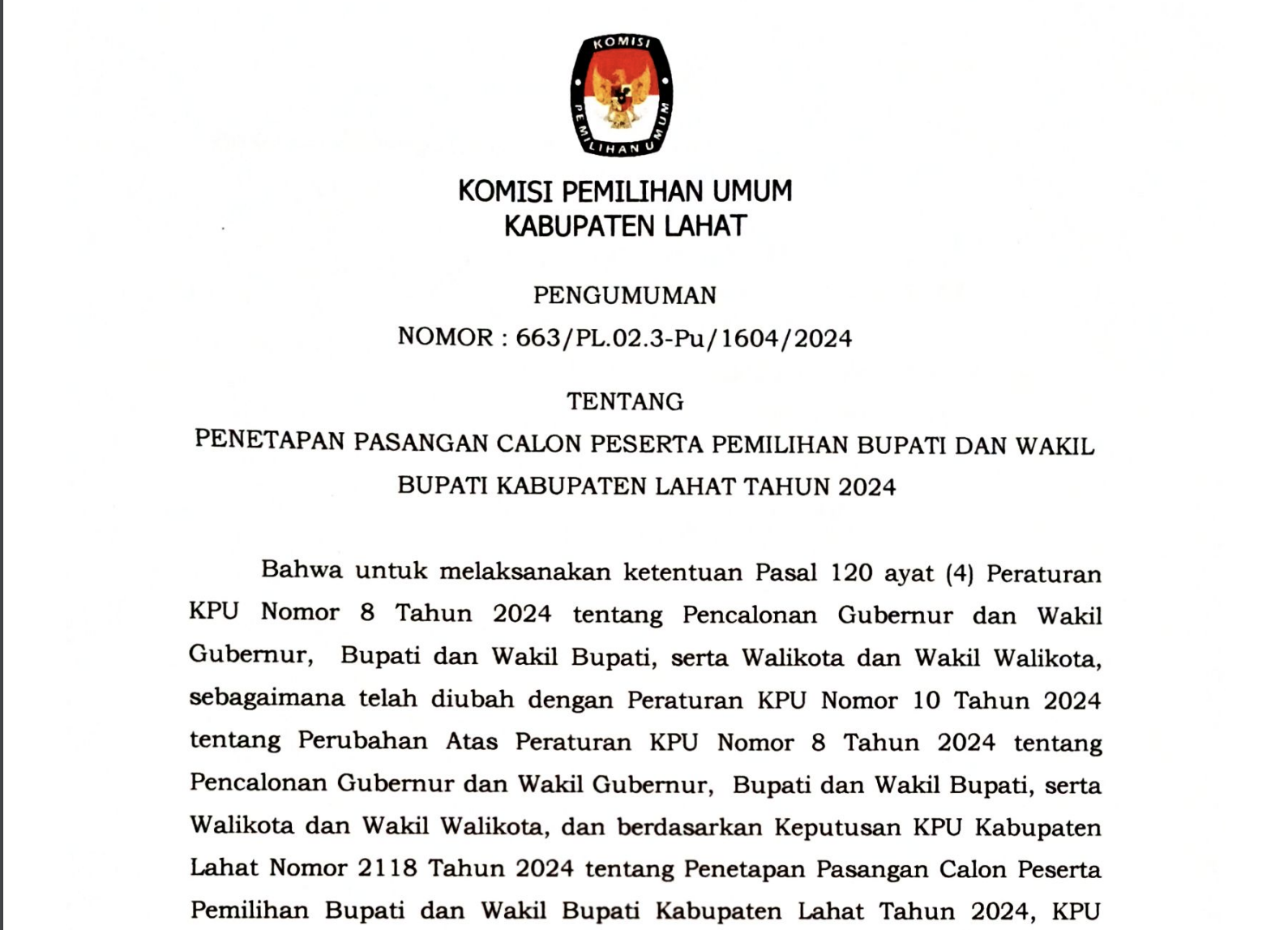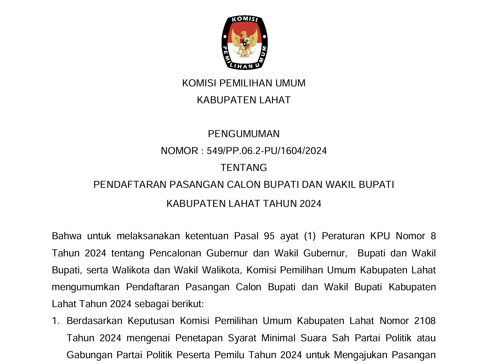 PENGUMUMAN PENDAFTARAN CALON BUPATI DAN WAKIL BUPATI KABUPATEN LAHAT TAHUN 2024 Sabtu, 24 Agustus 2024 21:56 682 Pengumuman selengkapnya dapat diunduh disini Baca Selengkapnya