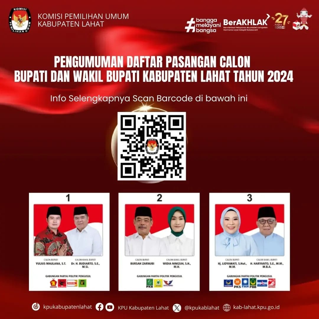 DAFTAR PASANGAN CALON BUPATI DAN WAKIL BUPATI LAHAT TAHUN 2024 Minggu, 13 Oktober 2024 07:00 939 Teman Pemilih berikut Daftar Pasangan Calon Bupati dan Wakil Bupati Lahat Tahun 2024 Baca Selengkapnya