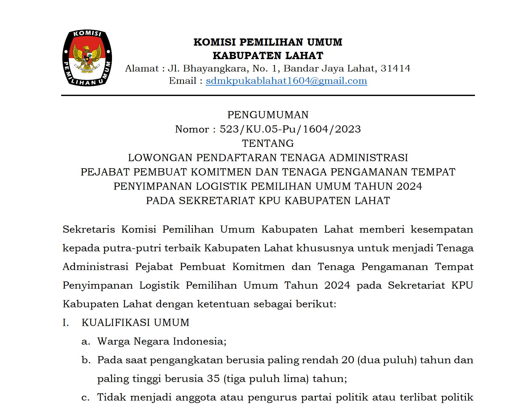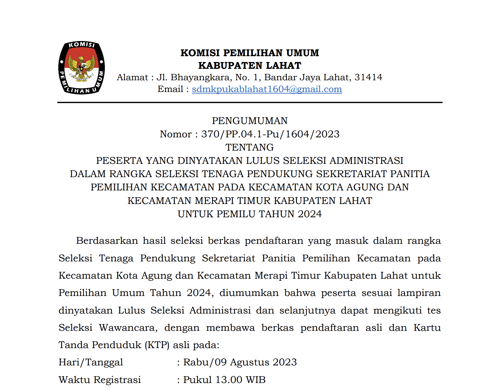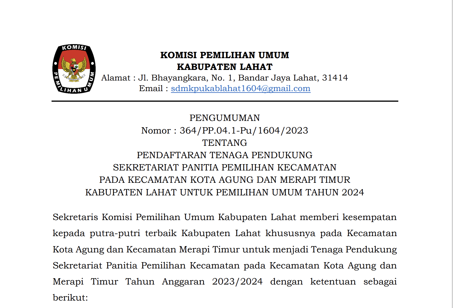 Sekretaris Komisi Pemilihan Umum Kabupaten Lahat memberi kesempatan kepada putra-putri terbaik Kabupaten Lahat khususnya pada Kecamatan Kota Agung dan Kecamatan Merapi Timur untuk menjadi Tenaga Pendukung Sekretariat Panitia Pemilihan Kecamatan pada Kecamatan Kota Agung dan Merapi Timur Tahun Anggaran 2023/2024