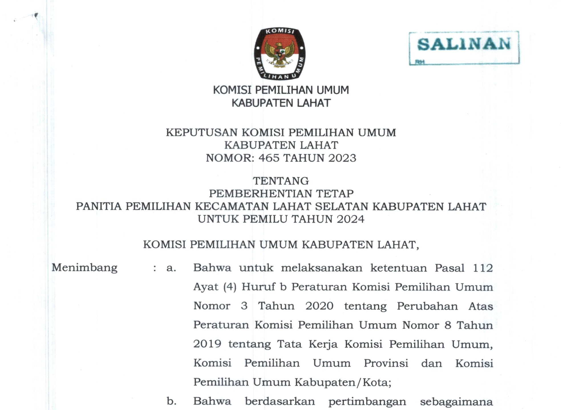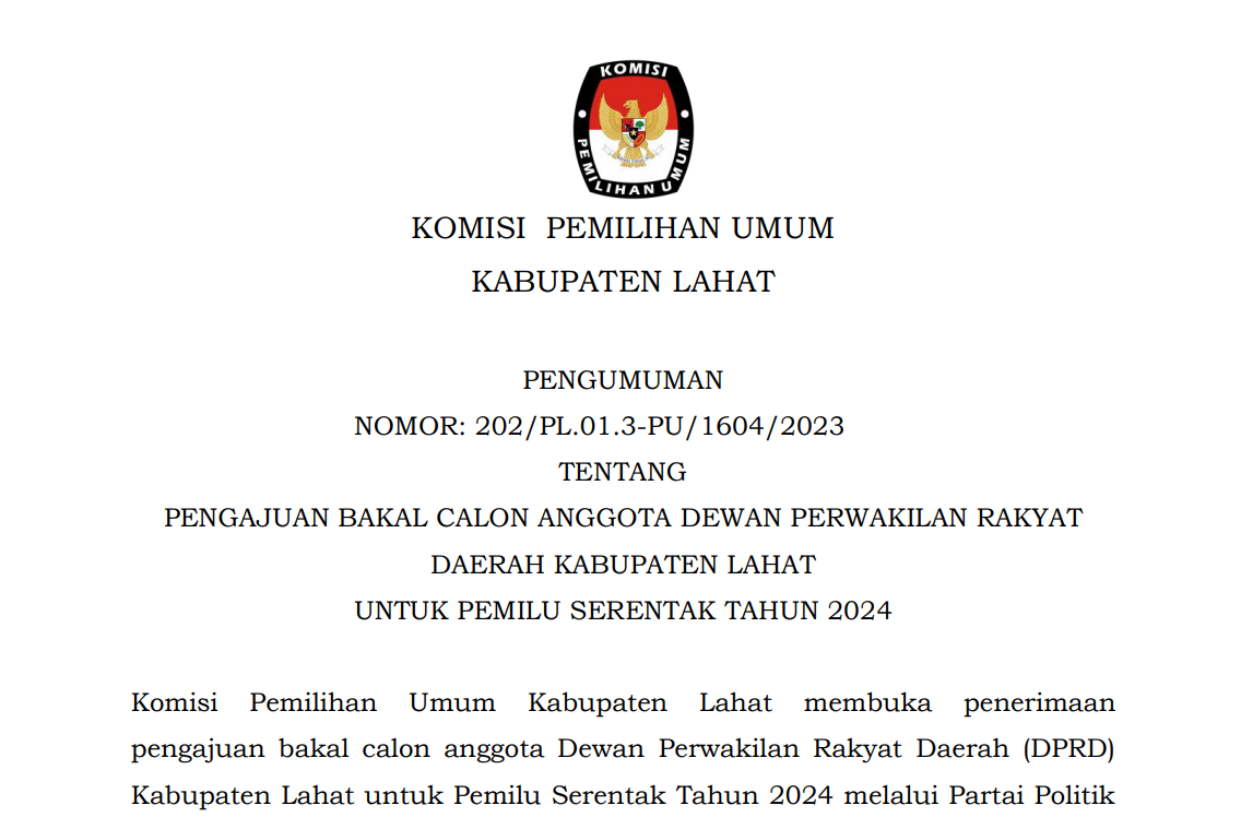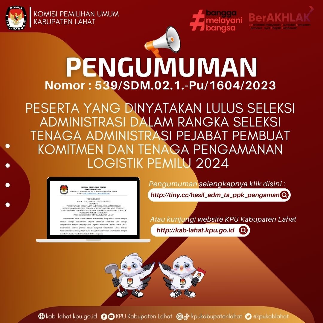 Sekretaris Komisi Pemilihan Umum Kabupaten Lahat memberi kesempatan kepada putra-putri terbaik Kabupaten Lahat khususnya pada Kecamatan Kota Agung dan Kecamatan Merapi Timur untuk menjadi Tenaga Pendukung Sekretariat Panitia Pemilihan Kecamatan pada Kecamatan Kota Agung dan Merapi Timur Tahun Anggaran 2023/2024