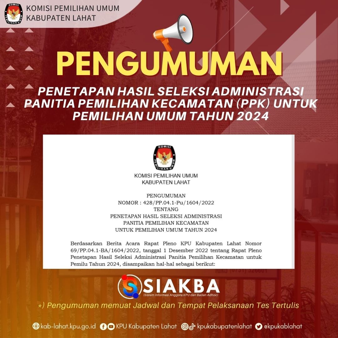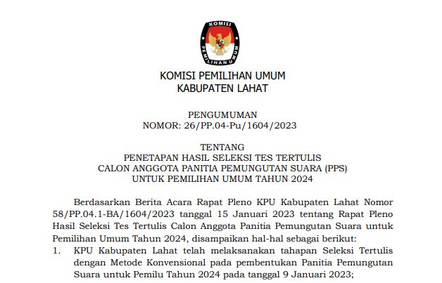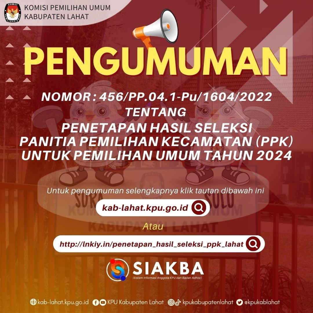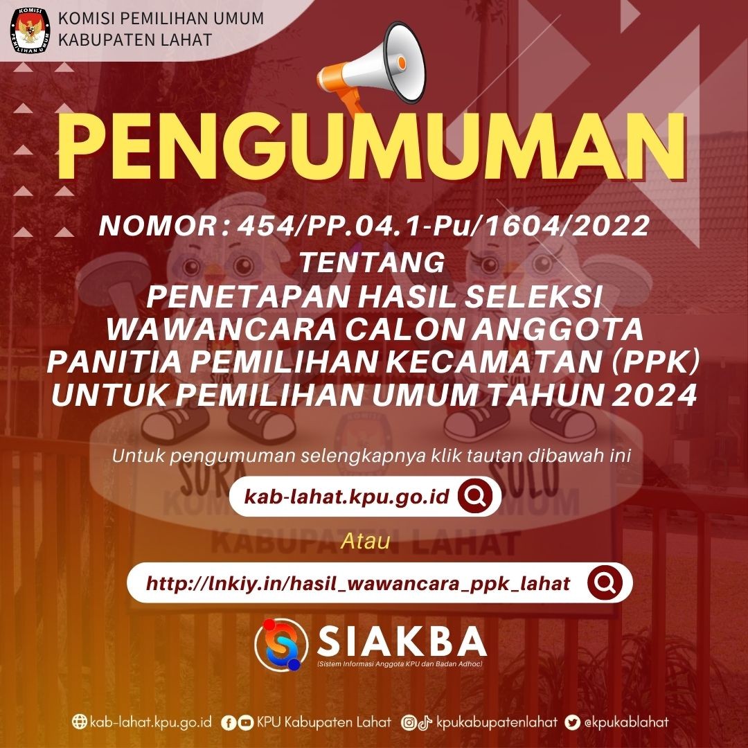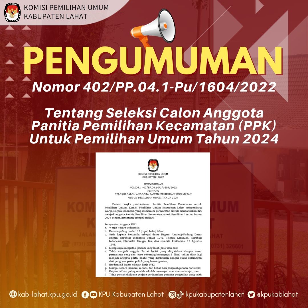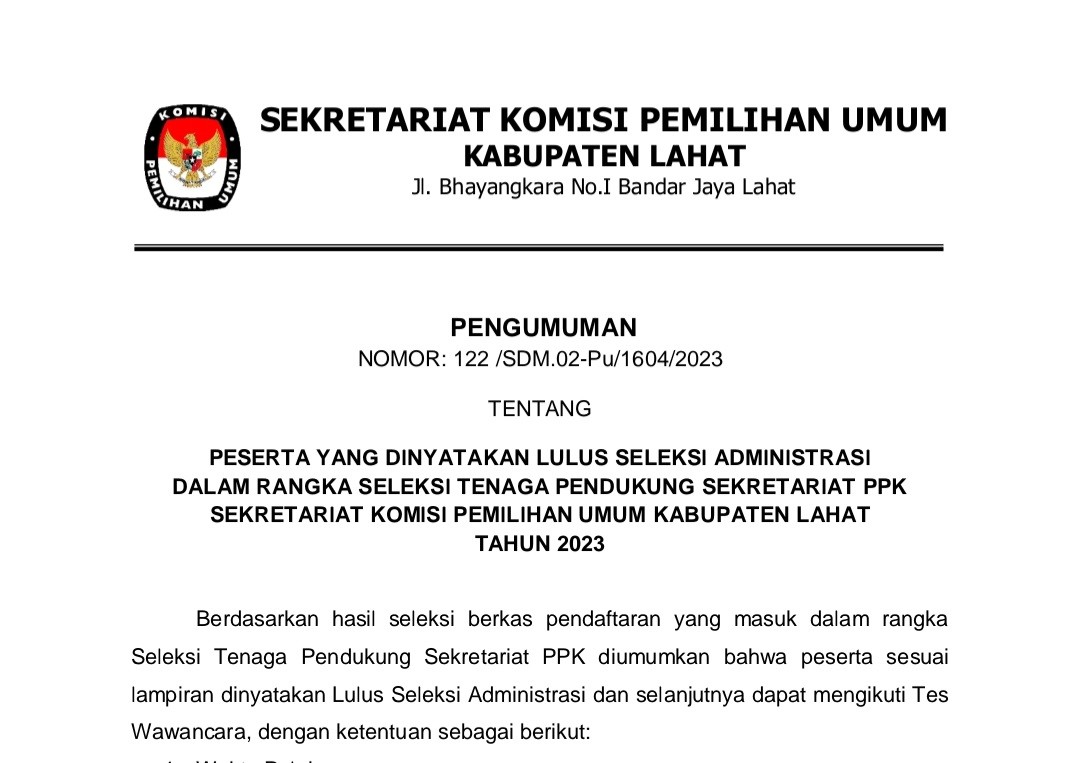 Teman Pemilih, Komisi Pemilihan Umum Kabupaten Lahat melalui Pengumuman ini memanggil Putra-Putri terbaik se-Kabupaten Lahat untuk dapat berpartisipasi menjadi bagian dari Penyelenggara Pemilu Tahun 2024 di tingkat Kecamatan se-Kabupaten Lahat.